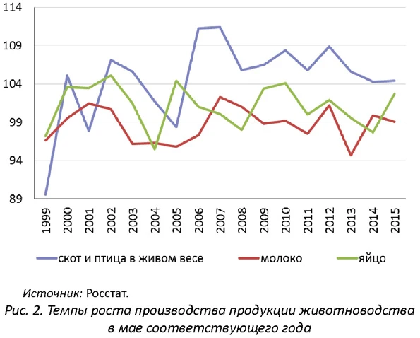 Сопоставление показателей прироста выпуска по основным продуктам в животноводстве показало, что темпы прироста в I кв.2015 г. находились в границах обычных многолетних колебаний (см. омэс №8). Однако если рассматривать показатели за май, то видно, что прирост по мясу и птице в живом весе в мае 2015 г., как и в мае 2014 г., является самым низким за последние 10 лет (см. рис. 2).