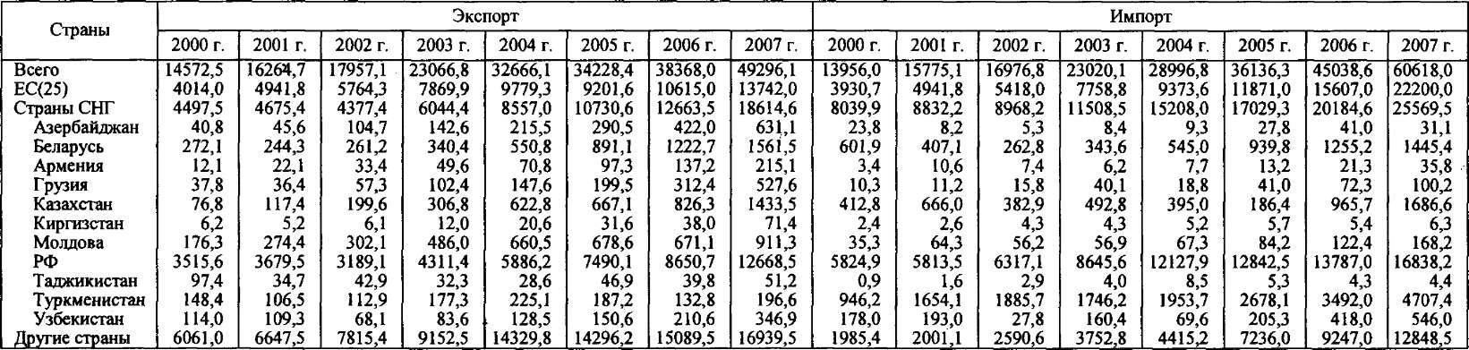 Анализ экономического и научно-технологического сотрудничества Украины и Российской ФедерацииДоминирующим направлением экономического сотрудничества между Украиной и РФ является развитие торгово-экономических отношений, создание условий свободного перемещения товаров, услуг, капиталов и рабочей силы. Осуществление согласованных мероприятий по реализации режима свободной торговли должно содействовать установлению гармоничных и стабильных экономических связей, а также созданию благоприятных условий для ведения эффективной торговли. Достижение поставленных целей предусматривает активное участие государств в развитии торгово-экономических отношений, разработке механизмов финансовой, информационно-консультационной и маркетинговой поддержки этих отношений. Россия является важнейшим торгово-экономическим партнером Украины, несмотря на то, что внешняя торговля между странами в отдельные периоды имела тенденцию к снижению. В частности, если в 1997 г. экспорт Украины в Россию составлял свыше четверти всего экспорта товаров, то в 2001 г. он составил 23%, а в 2002 г. -17,8%. На протяжении 1997-2002 гг. удельный вес России в украинском товарном импорте сокращался (с 48 до 37%). В 2000-2002 гг. стоимость импорта стабилизировалась на уровне 5,8-5,9 млрд. долл., а прирост общего импорта в Украину, который имел место в это время, состоялся не за счет импорта из России. Украина остается зависимой от импорта из России в большей мере, чем от экспорта в Россию. Однако зависимость от импорта уменьшается быстрее, чем от экспорта. Основу украинского экспорта в Россию составляет продукция машиностроения, химической промышленности, черной металлургии и пищевой промышленности. Преобладающая доля импорта из России (две трети) состоит из энергоносителей и другого сырья. Следовательно, экспорт товаров из Украины в Россию имеет более прогрессивную структуру, чем российский импорт. Украинский экспорт в РФ более диверсифицирован, чем импорт. Удельный вес машиностроения в экспорте Украины в Россию стабильно превышает 25% (в 2002 г. -35%). В последние годы взаимная торговля продукцией машиностроения между Россией и Украиной имеет тенденцию к увеличению. Согласно статистическим данным, экспорт товаров из Украины в РФ с 2001 по 2006 г. увеличился в 2,3 раза - с 3679,5 млн. долл. до 8650,7 млн. долл. В 2006 г. он составил 22,5% всего экспорта товаров Украины. Импорт товаров в Украину из РФ с 2001 по 2006 г. увеличился в 2,4 раза - с 5813,5 млн. долл. до 13787,0 млн. долл. В 2006 г. он составил 30,6% всего импорта товаров Украины. Данные табл. 1 и рис. 1 показывают общее состояние внешней торговли Украины товарами по сегменту стран. Они позволяют сделать вывод об интенсивном характере этого процесса в части экспорта и о некотором уменьшении в последние годы импорта из РФ и в целом из стран СНГ в пользу постепенного увеличения импорта из стран ЕС. Таблица 1 Внешнеторговый оборот Украины, млн. долл.