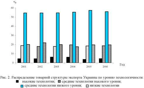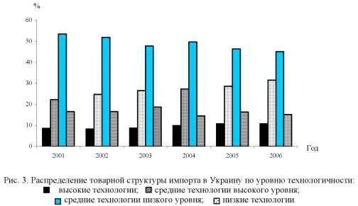 В связи с вышеизложенным закономерно считать, что удельный вес импорта в Украину высокотехнологичной продукции увеличился (рис. 3, [1]). В целом, динамика данного процесса стабильна. Структура украинского экспорта свидетельствует о неэффективности использования научно-технологического потенциала. Например, если в 2002 г. доля металлургической продукции в мировом экспорте составила 2,3%, а продукции машиностроения - 40,5%, то в Украине соответственно 39,7 и 13,6%.