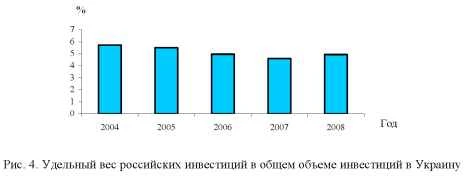 Украина на сегодня является ключевой страной в системе вложений капитала российским бизнесом как за счет своего значительного экономического потенциала, так и сложившегося разделения труда на постсоветском пространстве. Следует отметить, что на протяжении последних лет и общие объемы иностранного инвестирования в экономику Украины, и объемы инвестирования из России имеют положительную динамику (рис. 4). Так, удельный вес российских инвестиций в общем объеме иностранных инвестиций в 2004-2007 гг. имел тенденцию к падению (с 5,74% на начало 2004 г. до 4,62% на начало 2007 г.), а на протяжении 2007 г. он несколько увеличился (до 4,94% на начало 2008 г.).
