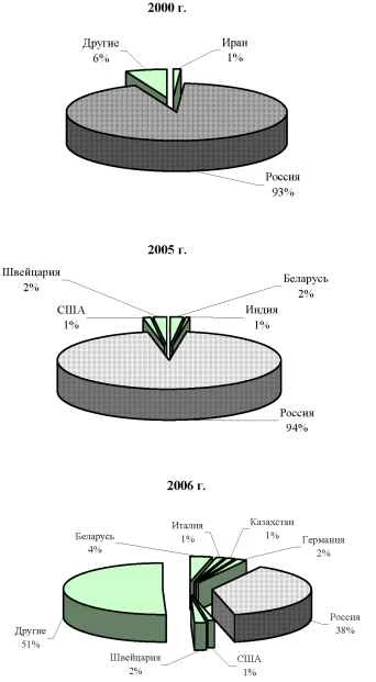 * Составлено по данным ВОИС. В 2006 г. список лидеров по подаче заявок на патентование не изменился. Республика Корея, где в 2006 г. наблюдался рост на 26,6% по сравнению с 2005 г., обогнала Великобританию и Францию и стала 4-й страной по количеству поданных по процедуре РСТ, а Китай, где использование заявителями системы РСТ возросло на 56,8%, обогнал Швейцарию и Швецию и занял 8-е место. В этой связи следует обратить внимание на состояние дел в сфере управления интеллектуальной собственностью в Украине. Структура подачи заявок на выдачу охранных документов в патентные ведомства других стран по годам показана на рис. 5-7 [10]. Как видно, во всех случаях Российская Федерация является основной страной, куда Украина направляет свои охранные документы для регистрации.