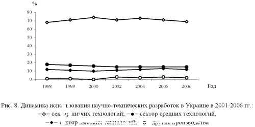 Опыт наиболее развитых стран показывает, что технологическая конкурентоспособность достигается благодаря ряду условий, среди которых можно выделить следующие: накопленный научно-технический потенциал; институциональные стимулы инновационных процессов; наличие крупных наукоемких компаний. Так, главная особенность научно-технологического потенциала как фактора долгосрочной конкурентоспособности состоит в том, что его создание и накопление («задел») требует десятки лет, в частности, наработок в сфере НИОКР, что содействует созданию новых видов технологий, а на их основе - отраслей. Динамика использования научно-технических разработок в Украине (рис. 8) свидетельствует о небольших масштабах освоения технологий, что является отрицательным фактором. В Украине, несмотря на определенное оживление в развитии инвестиционной сферы, постоянно наблюдается старение основных фондов - уровень их износа в среднем превысил в 2006 г. критическую границу 50%. Так, высокую степень износа (больше, чем в целом по экономике), имеют следующие виды экономической деятельности: обрабатывающая промышленность, образование, транспорт и связь - т.е. сферы инвестиционного направления (табл. 10), что свидетельствует о неэффективном влиянии фактора обновления основных средств на развитие технологичности и ин-новационности промышленного производства.