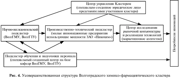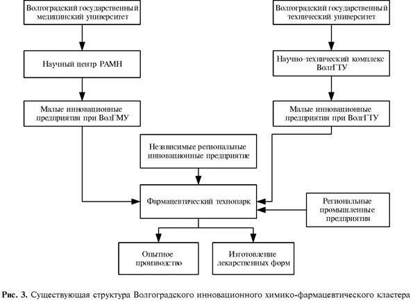 Формирование инновационно-промышленных кластеров привносит новый смысл в интеграционный процесс на уровне региональной экономики. Благодаря использованию представленной модели кластерообразования появляется обратная связь между всеми участниками интеграционных процессов, инновационные проекты приобретают практический характер и создаются предпосылки для эволюции региональной экономики. По мнению авторов статьи, главная цель инновационно-промышленного кластера не столько создать внутреннюю конкуренцию между существующими хозяйствующими субъектами, а прежде всего, взрастить, помочь окрепнуть новым высокотехнологичным промышленным предприятиям, которые заменят устаревающие морально и физически производства и создать дополнительную мотивацию к воспроизводству малых инновационных предприятий, как фундамента крупных современных промышленных предприятий. В качестве примера использования усовершенствованной модели инновационного кластерообразования, рассмотрим проект по созданию инновационного химико-фармацевтического кластера в Волгоградской Области. Существующая модель построения инновационного кластера полностью отвечает типовым стандартам построения кластеров, хотя и носит смешанный характер инновационного и промышленного. В представленной структуре (рис. 3) отсутствует единая система управления кластером и стратегия развития, все организационные и управленческие решения принимаются разрозненно каждым его элементом.
