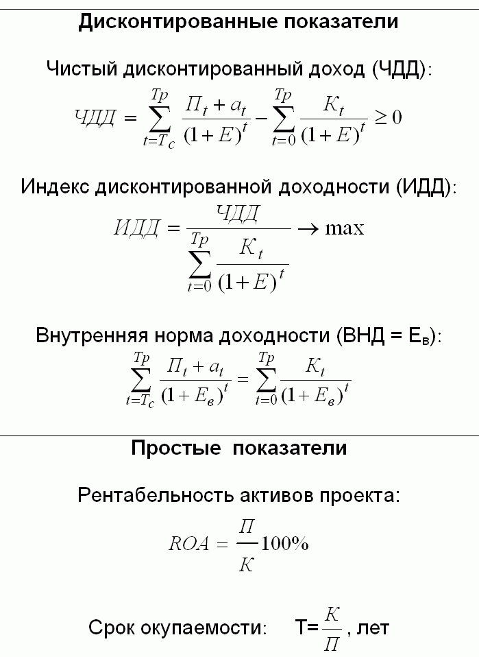 Таким образом, в группу показателей с учетом фактора времени входят три показателя: ОЭВ, ЧДВ, ИДВ. Эти сокращения образованы ключевыми понятиями их полных названий. Последний символ "В" обозначает учет фактора времени.