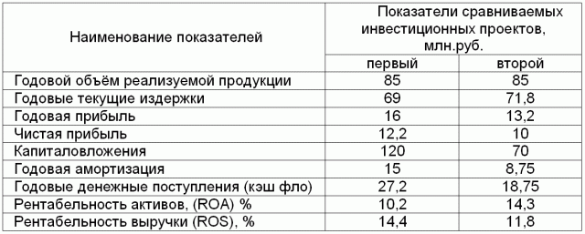 Собственные накопления для реализации обоих инвестиционных проектов на предприятии имеются. Необходимо выбрать более эффективный из них. Чтобы исключить влияние инфляции, учёт которой усложнил бы оценку влияния фактора времени, принимаем допущение о её отсутствии, которое не противоречит условиям развитого и стабильного рынка.