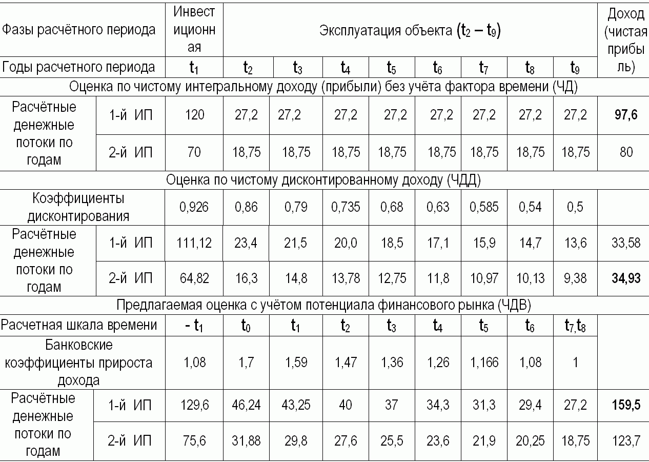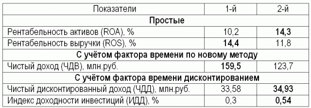Если принимать во внимание итоги сравнения по ЧДВ, то 1-й инвестиционный проект является безусловно лучшим. Однако ЧДВ, как и его аналог ЧДД, не является показателем эффективности, поскольку не показывает отдачу на 1 руб. затрат. Индекс дисконтированного дохода инвестиций выше во 2-м проекте. Рассчитать этот показатель по новому методу учёта фактора времени на данном этапе исследования мы ещё не умеем. Оценки же по простым показателям рентабельности противоположны: по рентабельности активов лучшим является 2-й, по рентабельности выручки – 1-й инвестиционный проект. В теории эффективности капиталовложений примат показателей ИДД и рентабельности активов незыблем. Поэтому лучшим является 2-й инвестиционный проект. Однако ряд соображений вызывает сомнения.