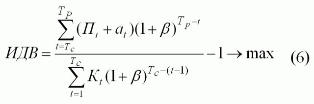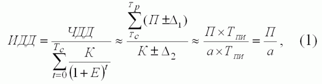 Индекс доходности инвестиций (ИДВ) представляет собой отношение приведенных по фактору времени чистой интегральной прибыли и инвестиций, выглядит следующим образом: