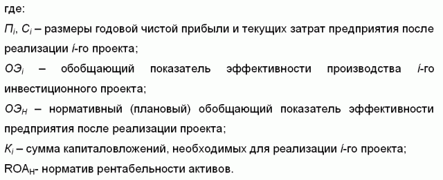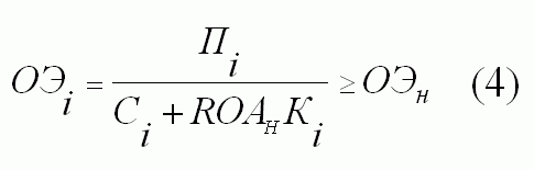 Числитель показателя ОЭi, как и требуется для оценки эффективности предприятия, представлен чистой прибылью. Слагаемое знаменателя ROАНКi представляет собой нормативную величину прибыли при инвестировании средств – Кi. Соответственно, годовая прибыль после реализации проекта (Пi) должна достигнуть суммы, не меньшей (ROАНКi). Знаменатель (Сi + ROАНКi), как несложно убедиться, представляет собой годовую стоимость продукции предприятия после реализации проекта, рассчитанную по модели цены производства.
