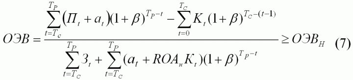 В числителе ОЭВ - сумма чистой прибыли инвестиционного проекта по годам эксплуатации предприятия с учетом фактора времени, исчисляемая по (5). В знаменателе – сумма интегральных значений амортизации и норматива прибыли с учетом фактора времени, а также годовых издержек производства (за минусом амортизации) без учета фактора времени, поскольку текущие издержки (исключая амортизацию) не могут приносить вторичный доход на финансовом рынке.