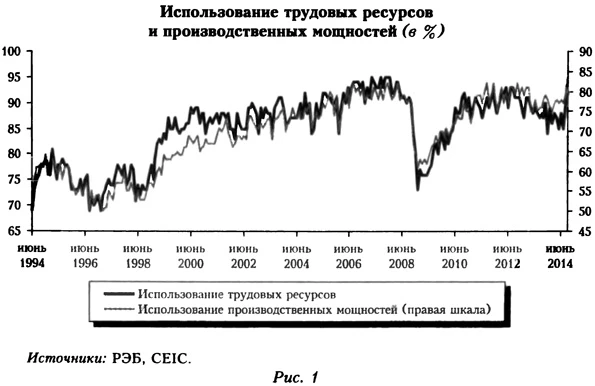 экономический советник Департамент денежно-кредитной политики Банка России Исаков А.В. к.э. н. старший преподаватель НИУ ВШЭ экономист ВТБ Капитал по России и СНГ Хазанов А.А. экономист Департамент денежно-кредитной политики Банка России стажер-исследователь ЛИСОМО РЭШ аспирант экономического факультета МГУ имени М.В. Ломоносова В отечественных научных журналах активно идет полемика относительно денежно-кредитной политики (далее — ДКП), проводимой Банком России. Среди последних работ, относящихся к этой теме, следует отметить статьи К. Юдаевой (2014), С. Глазьева (2014), а также отклик на эти работы в статье Д. Тулина (2014). В настоящей работе мы обсуждаем укоренившиеся в экспертном сообществе взгляды на цели и фактическую реализацию денежно-кредитной политики, опираясь на критику Банка России, представленную в статье А. Апокина с соавторами (2014). В серии статей, опубликованных экспертами Центра макроэкономического анализа и краткосрочного прогнозирования (ЦМАКП), обсуждается ряд вопросов, относящихся к ДКП, в том числе к инфляционному таргетированию, по которым у независимых экспертов и представителей регулятора к настоящему времени не сложилось единой позиции. По этой причине представляет интерес последовательный анализ основных тезисов, представленный Апокиным и его соавторами. Основной задачей нашей статьи является, таким образом, разбор критики в адрес ДКП Банка России с точки зрения экономической теории и сложившейся в профессиональной среде практики. Более общая цель — поддержать научную дискуссию по затронутым вопросам с учетом современных подходов к экономическому анализу. Критика Банка России затрагивает три обширных направления: некорректность оценки текущей ситуации в экономике, отсутствие преемственности в подходе к проведению ДКП и отсутствие опубликованной формулы правила ДКП (Апокин и др., 2014). В соответствующих разделах нашей работы мы подробно анализируем каждое направление критики. Неверная оценка текущего состояния экономикиОтправным пунктом для критики ДКП Банка России стали предложенные альтернативные оценки текущей экономической ситуации. Критикуя оценку Банком России экономической конъюнктуры, эксперты затрагивают три основные темы: интерпретацию конъюнктуры рынка труда, анализ загрузки производственных мощностей и оценки разрыва выпуска. Позиция Банка России по этим вопросам в 2014 г. представлена в декабрьском Докладе о денежно-кредитной политике (Банк России, 2014b, далее — ДоДКП). Обратимся последовательно к каждой из этих тем. Достаточно спорным мы считаем утверждение экспертов о том, что «линия аргументации Банка России, связанная с внешним сектором, для целей данной работы не существенна» (Апокин и др., 2014. С. 83). Без дополнительных пояснений авторы выносят за пределы обсуждения динамику внешнего сектора (цены на товарных рынках, внешний спрос, геополитические тенденции). Такое упрощение в современных условиях представляется недопустимым: в декабрьском ДоДКП указывается, что основными драйверами снижения курса рубля выступают падение цен на нефть и ограничение доступа на международные рынки капитала для российских компаний и банков. Подобные внешние условия чаще всего — в силу нетривиальности моделирования — остаются за рамками базовых макроэкономических моделей, на логике 
