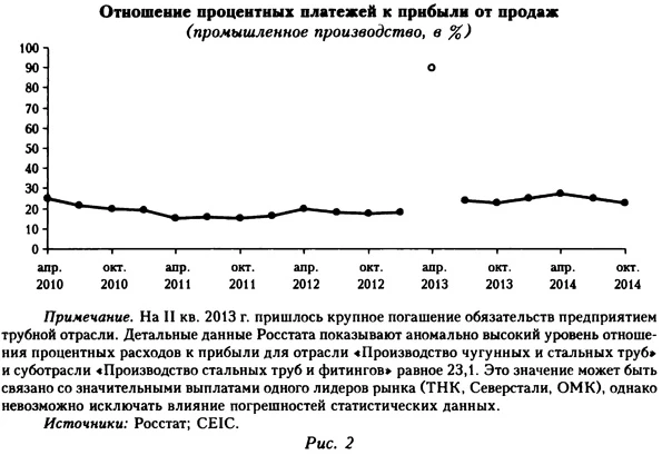 Согласно данным Росстата, на данный момент несколько снизилась загрузка мощностей в добывающем секторе. С этим связано на первый взгляд парадоксальное явление, когда, с одной стороны, оценки различными методами показывают негативный разрыв выпуска, а с другой — наблюдается почти полная загрузка мощностей на агрегированном уровне. Важно подчеркнуть, что недозагрузка мощностей в добывающей промышленности связана в первую очередь с внешней конъюнктурой, поэтому попытка стимулировать экономическую активность путем смягчения ДКП приведет к росту инфляции, но не к увеличению темпов экономического роста, что противоречит концепции инфляционного таргетирования. Важную роль при анализе текущей ситуации в экономике, в том числе в контексте утверждения о полной загрузке производственных мощностей, играет оценка разрывов выпуска, упомянутая выше. В качестве альтернативы методам оценки разрывов выпуска Банка России авторы выбрали несколько базовых подходов к оценке потенциального выпуска: одномерные модели (в том числе фильтр Ходрика—Прескотта) и неструктурные модели, включающие до трех наблюдаемых переменных. Следует особо подчеркнуть, что ни одна из выбранных авторами моделей не учитывает воздействие внешнего сектора ни на фактическую динамику выпуска у ни на потенциальный рост. Предсказуемы результаты применения базовых методов анализа: низкая устойчивость оценок, их значительный пересмотр с появлением новых данных и существенная вариация в зависимости от выбранного метода. Именно такой результат демонстрируют Апокин с соавторами, оценивая разрыв выпуска на конец 2014 г. в интервале от +0,4% до -7,5% потенциального выпуска. Общепринятые требования к идентификации потенциального выпуска следующие: несущественный пересмотр оценок с поступлением новых данных и согласованность с другими макроэкономическими переменными (Marcellino, Musso, 2010)1. Оценки при помощи базовых моделей, представленные в работе Апокина и соавторов, не удовлетворяют этим критериям, в том числе и потому, что не учитывают факторы, связанные с влиянием шоков внешней экономической конъюнктуры, особенно актуальные в 2014 г. Вместе с тем оценки, приведенные авторами, слабо согласуются как с оценками Банка России, так и с альтернативными оценками МВФ (IMF, 2014). В дополнение следует отметить, что ряд аргументов авторов, приведенных в контексте критики оценок выпуска Банком России, базируются на недостаточно обоснованной экстраполяции тенденций, которая слабо согласуется с поведением статистических индикаторов. Так, авторы утверждают, что «в секторе обрабатывающей промышленности... платежи по кредитам... в 2014 г. составят около 40% прибыли от продаж против 25% в 2011 г.» (Апокин и др., 2014. С. 81). Но авторам должны быть известны данные Росстата об отношении процентных расходов к прибыли в обрабатывающем производстве по меньшей мере за первый-второй кварталы 2014 г., которое составило соответственно 27,4 и 24,8%. На рисунке 2 видно, что данный показатель за наблюдаемый исторический период принимает стабильные значения в диапазоне 16-26% и не демонстрирует признаков роста. Следует отметить, что значения показателя в 2010 г., то есть непосредственно после активной фазы кризиса 2008-2009 гг., несущественно отличаются от более поздних. Кроме того, увеличение доли процентных расходов в общем объе