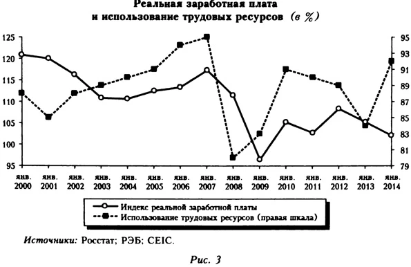 В дополнение к приведенным выше аргументам авторы указывают на то, что «в концепцию „полной загрузки мощностей" также не укладывается резкое замедление роста заработной платы» (Апокин и др., 2014. С. 83). Действительно, сокращение реальных заработных плат за 2014 г. составило 2%, что существенно ниже роста аналогичных показателей в 2013 и 2012 гг. — соответственно 5,3 и 8,4% (рис. 3). Однако выводы, которые делают на этом основании авторы, по ряду причин нам представляются спорными. В плане динамики разрыва выпуска и оценки границы производственных возможностей 2014 год во многом стал переломным для российской экономики. Большая часть года, по нашим оценкам, характеризовалась слабым отрицательным разрывом выпуска, единственным статистическим подтверждением которого была некоторая недозагрузка производственных мощностей в добывающей промышленности. При этом снижение загрузки в добывающей промышленности (по сравнению с 2013 г.) не только не сопровождалось повышением безработицы, но и сочеталось с положительными темпами роста реальных заработных плат, наблюдавшимися до октября 2014 г. На наш взгляд, положительные темпы роста реальных заработных плат свидетельствуют о том, что производители, во-первых, имели возможность не оптимизировать свои расходы и, во-вторых, предъявляли спрос на дополнительный труд.