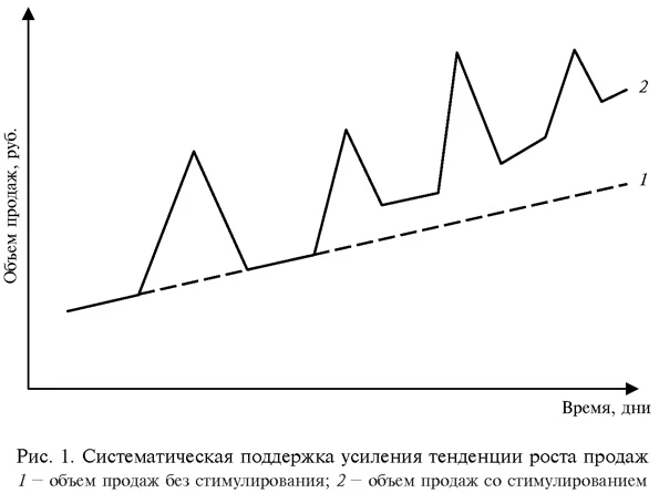 А также другие цели маркетинговых коммуникаций, не включающие прямое побуждение к покупке, увеличение доли рынка и позиционирование бренда. Безусловно, увеличение доли рынка невозможно без увеличения объемов продаж на растущем рынке, причем объем продаж должен расти более высокими темпами, чем емкость рынка. Однако прибыль компании при этом может и не расти. Прибыль от стимулирования, как краткосрочный результат деятельности организации, уступает место более долгосрочному показателю результативности — доле рынка, которая обеспечивает прибыль в перспективе не только за счет увеличения выручки, но и за счет снижения затрат при эффекте масштаба. Доля рынка является стратегическим параметром конкурентоспособности фирмы, показывающим ее лидирующее положение на рынке [12]. Денежная скидка на стандартный размер упаковки опережает скидку за увеличенную упаковку или размер покупки, вероятно, потому, что предполагает меньше транзакционных издержек, связанных с реализацией таких мероприятий. Производство, транспортировка, выкладка нестандартных упаковок большего размера связана с дополнительными расходами. Проще и дешевле предоставить скидку на стандартный товар. По регулярности проведения мероприятий лидируют регулярные мероприятия, не связанные с сезонностью или какими-то датами. Это говорит о постоянном характере проводимых мероприятий, их стратегическом планировании. Регулярное проведение рекламных акций позволяет постоянно стимулировать спрос и «поднимать» кривую объема продаж выше тренда объема продаж без стимулирования. Такая стратегия в [3] называется систематической поддержкой усиления тенденции роста продаж (см. рисунок).