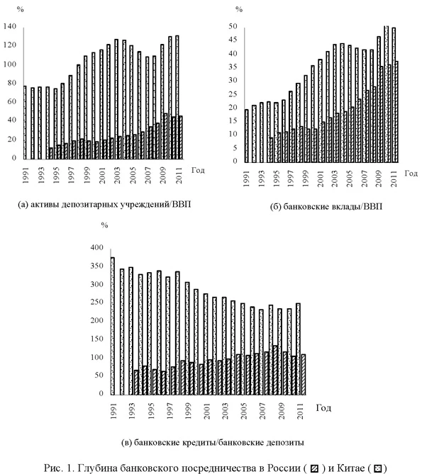 Размеры и институциональная структура банковской системыРазмеры банковской системыВ обеих странах сложилась модель финансового посредничества, основанная на банках (bank-based financial system). Коммерческие банки преобладают среди финансовых учреждений. В России им принадлежат свыше 90% всех активов финансовых учреждений, в Китае - 78,3% активов, 78,7% капитала, 74,5% всех сотрудников, 81,5% чистой прибыли всех финансовых учреждений2. Всего в Китае 3949 финансовых учреждений, но из них коммерческие банки составляют лишь шестую часть [3, p. 137]. Банковские кредиты являются главным источником внешних ресурсов для нефинансового сектора экономики. Однако в Китае банки уступают все большую долю рынка учреждениям, занимающимся теневым банкингом: по оценке экспертов МВФ, в 2012 г. примерно половина операций финансового посредничества происходила вне формального банковского сектора по сравнению с 10% в начале первого десятилетия ХХ в. [4, p. 3]. Россия пока отстает от Китая по глубине банковского посредничества, выраженной соотношением «активы/ВВП», тогда как по показателю «банковские вклады/ВВП» разрыв сократился (рис. 1) [8]. ^отношение между банковскими кредитами и депозитами постепенно растет в России и снижается в Китае. Это может означать, что российские банки начинают полнее использовать свою депозитную базу для фондирования кредитного портфеля, тогда как ранее ресурсы направлялись в некредитные активы. В Китае же банки движутся от рискованного соотношения 3,5/1 к большей сбалансированности.