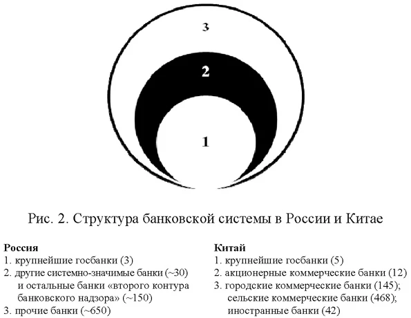 Количество действующих банков в России сокращается, а в Китае растет, составив к 2014 г. соответственно 829 и 6733. На первом этапе (1990-е годы) реформ в Китае консервативно подходили к учреждению новых банков (в отличие от других типов финансовых учреждений), тогда как в России на рубеже 1990-х годов произошел взрывной рост их числа. В Китае основной количественный прирост идет за счет сельских коммерческих банков, тогда как число основных типов банков - «крупных коммерческих», «акционерных» и городских - стабилизировалось. Возможно, после завершения создания системы сельских коммерческих банков начнется их укрупнение и консолидация. При этом в обеих странах постоянно увеличивается количество филиалов и иных внутренних структурных подразделений банков - 45603 в России [9, с. 13] и 85358 в Китае [10]. Повышается и насыщенность экономики банковскими учреждениями. Из-за разницы в размере территории и плотности населения в России приходится менее трех отделений коммерческих банков на 1000 кв. км территории, тогда как в Китае - девять. Но по числу банковских отделений на 100 тыс. взрослого населения Россия в пять раз превосходит Китай - соответственно 38,2 и 7,7 [10]. Уровни банковской системыБанковское законодательство обеих стран предполагает двухуровневую (two-tier) банковскую систему, отделяющую центральный банк от остальных банков. Де-юре в российском Законе о банках и банковской деятельности нет дифференциации кредитных учреждений по какому-либо признаку. В Китае закон 1995 г. о коммерческих банках установил различную минимальную величину уставного капитала для банков разного типа: 50 млн. юаней для сельского коммерческого банка, 100 млн. юаней для городского коммерческого банка и 1 млрд. юаней для «национального коммерческого банка». Де-факто в обеих странах структура банковской системы сложная, многоуровневая и иерархически выстроенная (рис. 2). Каждому из уровней системы соответствуют банки определенного типа, имеющие разный масштаб деятельности, обслуживающие клиентуру определенного типа и играющие разную роль в механизме денежной трансмиссии.