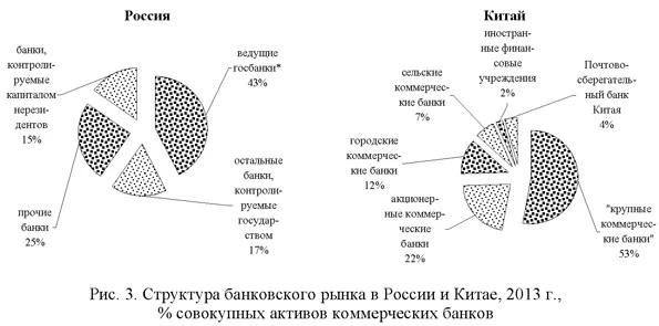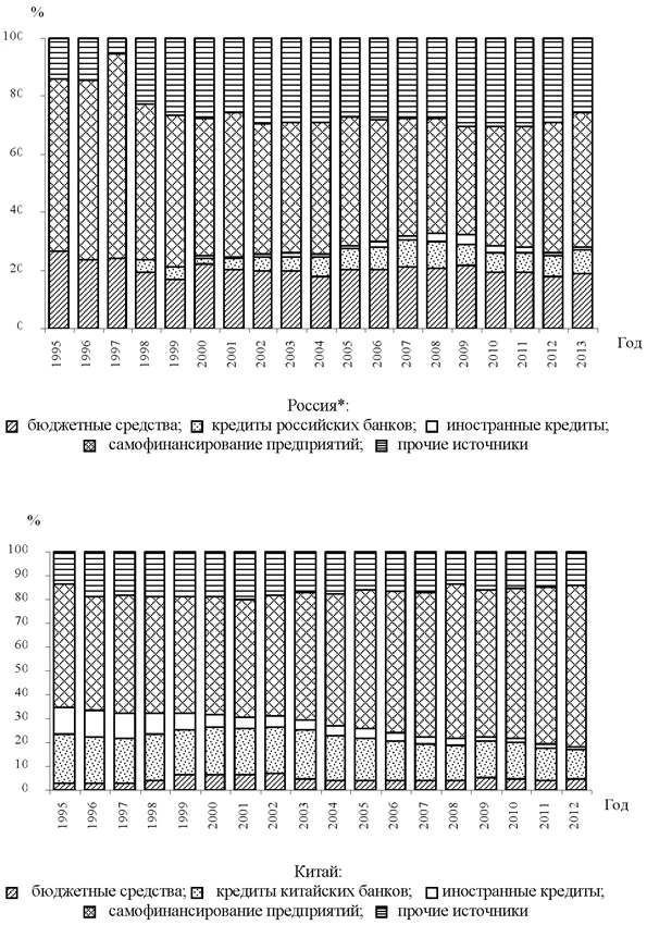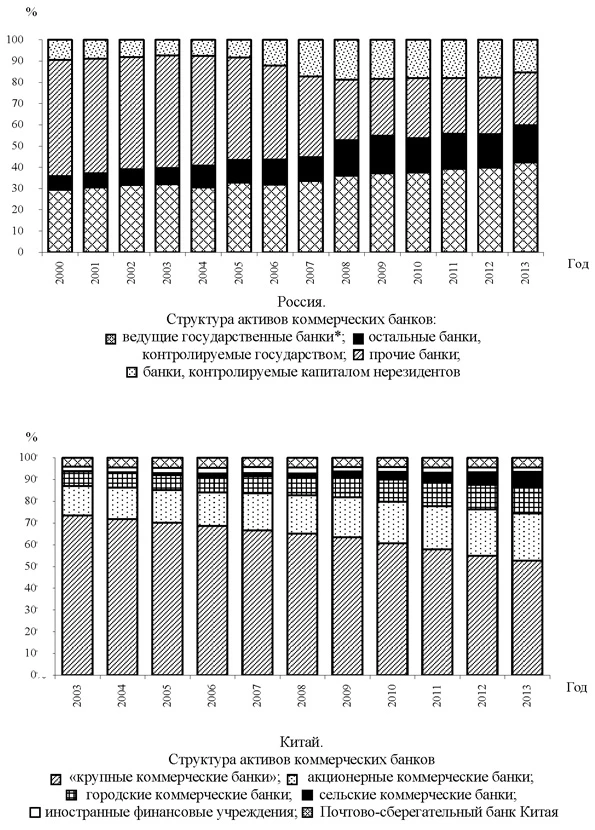 Источник: рассчитано по данным [13; 18]. * Классификация источников инвестиций в основной капитал по России приведена к сопоставимому виду со структурой данных по Китаю. В российской статистике нам не удалось найти данные за 1995-1997 гг. об объеме банковских кредитов для инвестиций в основной капитал. 1 Статья подготовлена при поддержке Российского гуманитарного научного фонда (проект 14-02-00422). 2 Рассчитано автором по данным Банка России [5] и Китайской комиссии по регулированию банковской деятельности (China Banking Regulatory Commission, CBRC) [6], подробнее см. [7]. 3 В Китае к коммерческим банкам мы относим 5 «крупных коммерческих банков» (основные государственные банки), 12 «акционерных коммерческих банков», 145 городских коммерческих банков, 468 сельских коммерческих банков, 42 иностранных финансовых учреждения [3, p. 137] и Почтово-сберегательный банк Китая. 4 Под внешними ресурсами мы понимаем разницу между общим объемом инвестиций в основной капитал из всех источников и самофинансированием предприятиями на эти цели. 5 Об инвестиционной активности ведущих банков с государственным участием мы судим по изменению их кредитного портфеля. Для сопоставимости с бюджетными расходами в годовом выражении показатель запаса (величина активов либо ссудной задолженности на определенную дату) преобразован в показатель потока (прирост либо сокращение кредитного портфеля, произошедшее за отчетный период). Выделить долю кредитов, приходящуюся на кредитование нефинансовых предприятий, по техническим причинам оказалось возможным только для России, поэтому расчетные показатели по Китаю завышены на величину всех прочих кредитов. 6 Так, Правительство РФ своим Распоряжением от 30 июля 2013 г. №1343-р установило перечень инвестиционных проектов, сопровождение реализации которых в качестве единственных исполнителей должны будут осуществлять ОАО «Сбербанк России», ОАО «Газпромбанк» и ОАО «Банк ВТБ». 7 К этой же категории с оговоркой можно отнести ОАО «Газпромбанк». Литература 1. Сперанская Т.С. Анализ российской модели банковской системы в сравнении с китайской моделью // Проблемы прогнозирования. 2009. № 2. 2. Верников А.В. «Национальные чемпионы» в структуре российского рынка банковских услуг // Вопросы экономики. 2013. № 3. 3. CBRC (2014), Annual Report 2013. Beijing: China Banking Regulatory Commission. [на китайском языке] 4. Liao Wei, Tapsoba S. (2014), China's Monetary Policy and Interest Rate Liberalization: Lessons from International Experiences // IMF Working Paper No. 14/75. Washington DC: International Monetary Fund. 5. Центральный Банк Российской Федерации. Официальный сайт. http://www.cbr.ru 6. CBRC. Annual Report. (2006-2013). Beijing: China Banking Regulatory Commission, 2007-2014. 7. Верников А.В. Структурно-институциональное сходство банковских систем России и Китая. Препринт WPI/2014/04. М.: Изд. Дом Высшей школы экономики. 8. WorldBank, Financial Development and Structure Dataset (updatedNov. 2013). Washington DC: The WorldBank. 9. Отчет о развитии банковского сектора и банковского надзора в 2013 году. М.: Банк России, 2014. 10. IMF (2014), Financial Access Survey. Washington DC: International Monetary Fund. http://fas.imf.org/ [дата обращения: май 2014]. 11. Vernikov A. (2009), Russian Banking: The State Makes a Comeback? // BOFIT Discussion Papers DP 24/2009. Helsinki: Bank of Finland. 12. Верников А.В. Доля государственного участия в банковской системе России // Деньги и кредит. 2009. № 11. 13. The Banker. July 2014. 14. Рейтинговое агентство «РИА Рейтинг». http://www.riarating.ru 15. PSBC(Postal Saving Bank of China). http://psbc.com/ 16. The Finantial Times. 11.03.2014. http://www.ft.com/ 17. National Bureau of Statistics China. http://www.quandl.com/STATCHINA-National-Bureau-of-Statistics-China/F0505-Sources-of-Funds-for-Investment-in-Fixed-Assets-in-the-Whole-Country) 18. 