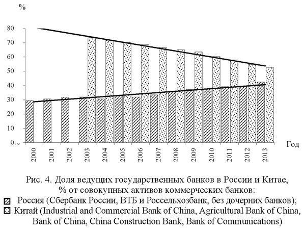 Ядром кредитной системы каждой из стран являются крупнейшие банки с государственным участием. В России суммарная доля Сбербанка, ВТБ и Рос-сельхозбанка достигла 42%. В Китае доля крупнейших государственных банков в совокупных активах коммерческих банков с 2003 по 2013 г. сократилась с 74% до 53% (рис. 4) [3; 5; 13; 14], а в общем числе занятых в банках - до 61%, создав иллюзию «ухода» государства (см. Приложение 1). Разнонаправленная динамика после 2000 г. объясняется тем, что в предшествующий период в России произошло обрушение системы государственных специализированных банков, тогда как в Китае ничего подобного не было. Номинальная доля государственной собственности дает неполную картину происходящего в банковской системе таких стран, как Россия или Китай. Помимо прямого акционерного контроля, государство имеет много других возможностей для удержания в своей орбите компаний и банков: это и распределение ликвидности, и госзаказ в форме привлечения банков к участию в национальных проектах и обслуживанию государственных организаций. В России есть примеры того, как номинально частные или даже иностранные банки действуют в унисон с органами государственной власти или отдельными кланами чиновников. Есть, впрочем, и обратные примеры, когда номинально государственные банки, попав под контроль своих менеджеров, отдаляются от государственных интересов и начинают работать в ином режиме (Банк Москвы до его поглощения банком ВТБ).