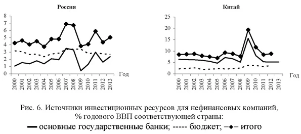 По России оценки доли, принадлежащей национальным частным банкам, варьируют в диапазоне от 25 до 31%. В Китае эта величина зависит от строгости дефиниций и вряд ли превышает 3%. Официальные источники упоминают 12-процентную долю частного капитала в банковской отрасли, но она складывается из миноритарных участий в капитале китайских банков без права контроля, а частным считается лишь Minsheng Bank. В марте 2014 г. было объявлено о начале эксперимента, в ходе которого возникнут пять банков, полностью принадлежащих частным фирмам [16]. Доля банков, контролируемых капиталом нерезидентов, в Китае стабилизировалась на уровне 2%, причем в нее включаются как иностранные филиалы, так и созданные в стране учреждения с участием иностранного капитала. В России доля таких банков достигла к 2008 г. почти 19%, но затем сократилась к 2014 г. до 15,3%. Политика государства в отношении коммерческих банковУчастие банков в кредитовании нефинансового сектора экономикиОсновной пункт различий между банковскими системами России и Китая, отмеченный Т. Сперанской в вышеуказанной статье, это функциональная роль банков в хозяйстве, их значимость для общества и критерии принятия банками инвестиционных решений [1]. Удельный вес кредитов, полученных от национальных банков, среди всех источников инвестиций в основной капитал нефинансовых компаний составляет примерно 7-8% в России и 13-15% в Китае, при этом разрыв сокращается (рис. 5-а) [17; 18]. Кредиты национальных банков составляют важную, хотя и не преобладающую часть внешних ресурсов, привлеченных нефинансовыми компаниями для инвестиций в основной капитал4: около 40% в Китае и 14-16% в России (рис. 5-б и Приложение 2). Доля средств государственного бюджета в инвестициях в основной капитал китайских предприятий ниже, чем в России (соответственно 4-5% и примерно 20%). Общие бюджетные расходы в Китае также выглядят скромнее, чем в России - 24,8% ВВП по сравнению с 37,1% ВВП [19, p. 74]. В отрыве от контекста эти факты можно было бы интерпретировать как отход Китая от централизации и перераспределения инвестиционных ресурсов. Однако есть предположение, что финансирование из государственного бюджета замещено кредитами государственных банков.