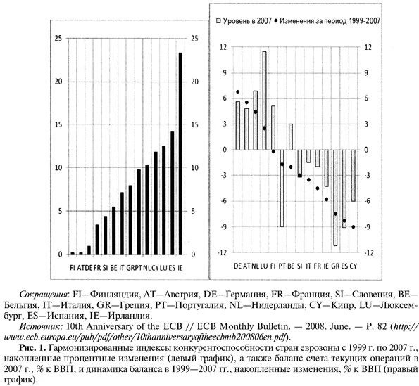 * Общий баланс бюджета (дефицит/профицит) без учета чистых процентных выплат по долгу. ** Циклически скорректированный первичный баланс (cyclically adjusted primary balance) —циклически скорректированный баланс бюджета (cyclically adjusted budget balance — CABB) без учета чистых процентных выплат по долгу. CABB показывает, каким являлся бы бюджетный дефицит при нормальном уровне деловой активности в стране (при потенциально достижимом ВВП) и при том условии, что принципы и правила, определяющие госрасходы, а также налоговые ставки остаются неизменными. Источник: International Monetary Fund. Fiscal Monitor. — 2011. — September. Р. 30, 32. Наконец, обращает на себя внимание следующее: страны еврозоны, имея сопоставимые или даже более низкие показатели дефицита и долга по отношению к другим развитым странам, оказались гораздо чувствительнее к долговому кризису. Поиск специфических причин такой уязвимости выводит на сюжеты о незавершенности интеграционных процессов в монетарной и бюджетной сферах, а также о максимальной остроте противоречий формировавшихся в области их «пересечения» (отсюда и очередность проводимых реформ). Чтобы лучше понять истоки этих противоречий, стоит вспомнить, что многие из них осознавались еще в процессе создания ЭВС. Ряд экономистов указывал на необходимость более глубокой реальной экономической и финансовой интеграции и более тесной координации экономической политики стран ЕС до перехода к единой валюте. Предлагалось либо ограничить введение евро небольшой группой стран, либо отложить переход к единой валюте на более поздний срок, либо активизировать усилия по реальной конвергенции после введении евро (за это выступали прежде всего немецкие экономисты8); фактически речь шла о том, что валютный союз должен следовать за процессом реальной экономической конвергенции. Противоположной точки зрения придерживались французские и итальянские экономисты, полагавшие, что полная номинальная конвергенция в качестве предтечи евро вовсе не обязательна, поскольку сама валютная интеграция станет «драйвером» реальной конвергенции. Именно вторая позиция и была реализована на практике. Функциональная цепочка «таможенный союз — общий рынок товаров, услуг, капитала и рабочей силы» оказалась дополненной общей валютой, а также специальным институциональным механизмом для осуществления общей на территории всех государств-членов валютной политики — Европейской системой центральных банков во главе с Европейским центральным банком. Одновременно единая валюта и единая монетарная политика, проводимая ЕЦБ, призваны была разрешить противоречие «невозможной троицы», или трилеммы денежной политики9. Необходимость создания валютного союза и переход к единой валюте диктовалась насущными потребностями уже созданного единого рыночного пространства объединенной Европы со свободным перемещением товаров, капиталов и физических лиц, закрепленного принятием 1 июля 1987 г. Единого европейского пакта. Однако в документе, регулирующем устранение всех препятствий на пути движения капиталов, было всего лишь два пункта, касающихся валютного сотрудничества стан ЕС: о необходимости конвергенции экономической и денежно-кредитной политики государств-членов, а также о возможности соответствующих институциональных изменений. Поэтому перед группой разработчиков, известной как «Ко
