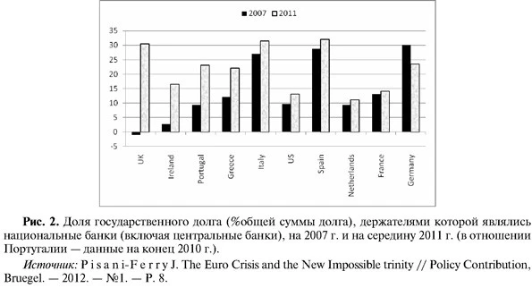 * Применительно к Греции — долг центрального правительства, 2-й кв. 2011г.; к Ирландии — долгосрочные облигации центрального правительства, 2-й кв. 2011г.; к Португалии — общий госдолг, 4-й кв. 2010 г.; к Италии и Испании — общий госдолг, 2-й кв. 2011г.; к Германии — долг центрального правительства, региональных и местных властей, 1-й кв. 2011г.; к Франции — долгосрочные гособлигации (OAT), 2-й кв. 2011г.; к США — казначейские облигации федерального правительства, 2-й кв. 2011г.; к Великобритании — облигации центрального правительства (Gilts), 1-й кв. 2011 г. Источник: P i s a n i-F e r r y J. The Euro Crisis and the New Impossible Trinity // Policy Contribution (Bruegel). — 2011. — №1. — Р. 8. Объясняя требование ограничить долю гособлигаций в активах банков, эксперты ссылаются на то, что экономики стран, переживающих банковский кризис, обычно очень слабы. Это означает снижение налоговых поступлений и увеличение госрасходов, связанных с мерами поддержки национальных экономик. Иными словами, банковские кризисы практически всегда сопровождаются большими бюджетными дефицитами. В этой ситуации госфинансы оказываются под давлением, даже если большая часть прямых расходов, связанных с банковским кризисом, ложится на европейский уровень через механизмы банковского союза. В таких условиях риск-премия по гособлигациям возрастает, и возникает естественное давление на национальные банки этих стран — их подталкивают становиться «покупателями последней инстанции» госдолга. У ЕЦБ же нет эффективных инструментов предотвращения такого хода событий, во всяком случае, в отношении небольших банков, которые принимают на себя эту роль в массовом масштабе. Но как только местные банки накапливают большие объемы госдолга, государства и кредитные организации снова оказываются в разрушительной самоусиливающейся петле обратной связи, которая уже привела еврозону на грань краха в 2011—2012 гг. и оставляет ее уязвимой к подобным потрясениям в будущем27. Ослабление зависимости банков от государства (прежде всего от их национального государства) отвечает интересам всех, поскольку делает финансовую систему более стабильной, но особенно — интересам стран-кредиторов, поскольку рыночная дисциплина может быть эффективной только тогда, когда система устойчива. Спасательные операции в Греции (и других странах) были мотивированы тем, что перспектива суверенного дефолта дестабилизировала бы всю банковскую систему еврозоны. Этого могло не произойти, если бы банки стран зоны евро не держали столь большой объем гособлигаций на своих балансах. На рис. 2 показаны доли госдолга стран еврозоны, Великобритании и США, держателями которого были национальные банки. При этом везде, кроме Германии, эта доля выросла в период кризиса. Одновременно было замечено, что инъекции ликвидности со стороны ЕЦБ (особенно в 2009 г. и после октября 2011 г.) поощряли банки к увеличению покупок государственного долга за счет сокращения кредитования частного сектора28.