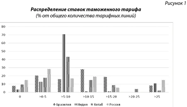 Источник: официальный сайт Всемирной торговой организации: Statistics database/ Tariff Profiles; http://stat.wto.org/TariffProfile/WSDBTariffPFView.aspx?Language=E&Countr y=BR,CN,IN,RU В российском таможенном тарифе обращает на себя внимание довольно высокая доля неадвалорных тарифов: 2,3% от общего количества тарифных линий приходится на специфические пошлины (взимаемые с количества, объема или веса ввозимого товара), 12,6% - на комбинированные (содержащие адвалорную и специфическую составляющие и взимаемые либо выборочно, либо в сумме). При этом следует отметить, что ВТО рекомендует использовать адвалорные пошлины, поскольку они более прозрачные и сопоставимые. По адвалорной составляющей самыми защищенными в РФ являются такие группы ТН ВЭД ТС, как мясо и мясные субпродукты (средняя адвалорная ставка 37%); ковры и напольные покрытия (средняя адвалорная ставка 20%); оружие и боеприпасы (средняя адвалорная ставка 19%); алкогольные и безалкогольные напитки и табак (средняя адвалорная ставка 29,2%); готовые текстильные изделия (средняя адвалорная ставка 18%); природный жемчуг (средняя адвалорная ставка 18%). В ближайшие годы наиболее высокий уровень тарифной защиты сохранится для драгоценных металлов и камней (12-17%), изделий из кожи и пушнины (1215%), продовольственной и металлургической продукции (7-10%). Планомерное снижение российских таможенных пошлин будет продолжаться вплоть до 2018 г., как предусмотрено переходными периодами для разных категорий товаров. ВЫВОДЫПри анализе тарифного регулирования в странах БРИК, прежде всего, обращает на себя внимание глубоко дифференцированная товарная номенклатура таможенного тарифа. Общее число товарных позиций в таможенном тарифе Бразилии -10031, России - 11613, Индии - 11328, КНР - 7977. Учитывая, что стандартная шестизначная номенклатура ГС имеет 5019 позиций, таможенные тарифы названных выше государств направлены на создание развитой национальной товарной номенклатуры, выходящей за шестой знак ГС. Анализ «национальной» составляющей тарифной номенклатуры показывает, что она всегда формируется в результате учета реальных национальных экономических интересов страны. За шестой знак товарной номенклатуры ГС выводятся товары, в защите производства которых страна заинтересована или выделение которых необходимо для ведения торговых переговоров, иногда и для других целей, включая фискальные. В процессе переговоров о присоединении к ВТО страны обязуются «связать» ставки своих импортных тарифов, т.е. принимают на себя обязательства не повышать импортные пошлины выше уровня, достигнутого на переговорах. Анализ таможенных тарифов зарубежных стран показал, уровень связанных тарифов в странах-основателях ВТО, к которым относятся Бразилия и Индия, значительно превышает уровень применяемых ставок, что говорит о том, что эти страны оставляли за собой возможность при необходимости воспользоваться тарифной защитой внутреннего рынка от излишнего импорта. Присоединившийся к ВТО в 2001 г. Китай, а тем более Россия, ставшая членом ВТО в 2012 г., не смогли получить такое преимущество. В результате тарифной либерализации регулирования международной торговли в рамках ГАТТ/ВТО увеличилось количество импортируемых товаров, необлагаемых таможенными пошлинами. Среди стран БРИК наибольшая доля необлагаемых пошлинами тарифных линий отмечается в российском таможенном тарифе. В по
