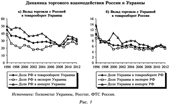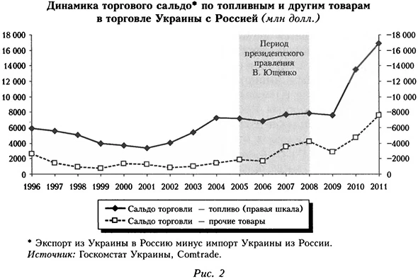 Рост товарооборота России и Украины обусловлен привлекательностью российского рынка. Украина в последние годы активно стремится компенсировать отрицательное сальдо в торговле топливными товарами с Россией за счет положительного сальдо по другим товарам. (Правда, когда президентом был В. Ющенко, проводивший активную прозападную политику, отрицательное сальдо в торговле с Россией топливными товарами увеличивалось при одновременном падении положительного торгового сальдо по другим товарам.) После избрания В. Януковича Украина получила возможность частично компенсировать дефицит валюты по торговле минеральными ресурсами за счет торговли другими товарами. Но Украина явно не использовала все возможности для усиления позиций на растущем рынке России и пока не может удержать сложившиеся рыночные позиции. Экономически торговля ненефтегазовой продукцией более выгодна, чем торговля топливом, и при росте ее экспорта на российский рынок страна может легко перекрыть дефицит платежного баланса. Однако фактически этого не происходит, и сохраняется дефицит в торговле Украины с Россией.