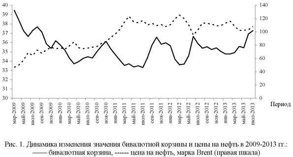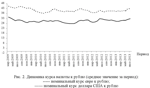 Динамика бивалютной корзины во многом определяется поведением цены на нефть. Так, под влиянием кризиса, спровоцировавшего снижение спроса на энергоносители и соответствующее понижение цены на нефть, стоимость бивалютной корзины достигла достаточно высокого значения. Отдельно следует выделить период весны-осени 2010 г., когда повышение уровня бивалютной корзины объяснялось не столько ценой на нефть, сколько нестабильностью финансового рынка России в связи с кризисом в еврозоне. То же можно сказать и о периоде 2011 г. В I кв. 2012 г. стоимость бивалютной корзины снизилась, краткосрочная волатильность корзины возросла по сравнению с 2011 г. В 2013 г. снижение цены на нефть увеличило волатильность бивалютной корзины (с резким возрастанием ее стоимости в июле). Во время мирового экономического и финансового кризисов массовый отток капитала из страны оказал давление на рубль в сторону его ослабления, усиливая одновременно девальвационные ожидания экономических агентов. В феврале 2009 г. курсы рубля к евро и доллару достигли своего минимального значения: 45,7 и 35,76 руб. за единицу иностранной валюты соответственно. Но после непродолжительного периода восстановления на валютный курс оказал влияние европейский кризис, вызвавший изменение цены на нефть и отток капитала, но уже преимущественно европейского (рис. 2) [4].