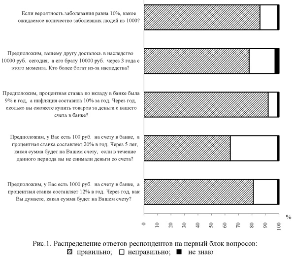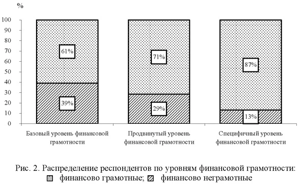 ВыводыТаким образом, можно сделать следующие выводы. Во-первых, российские граждане имеют достаточно низкий уровень финансовой грамотности: только 39% респондентов являются финансово грамотными согласно базовому уровню финансовой грамотности, 29% опрошенных являются финансово-грамотными согласно продвинутому уровню, и только 13% понимают специфику российского фондового рынка. Во-вторых, уровень финансовой грамотности респондентов влияет на их степень участия на финансовом рынке. Более финансово образованные люди более активно работают на фондовом рынке, инвестируют пенсионные накопления и имеют меньше просроченной задолженности по кредитам в банке. Полученные результаты опросов российских граждан подтверждают результаты довольно значительного количества подобных исследований в развитых и развивающихся странах. Однако стоит отметить, что согласно полученным нами данным для участия на финансовом рынке необходимо владеть как минимум продвинутым уровнем финансовой грамотности. Понимание реальной специфики российского рынка влияет только на активность граждан на фондовом рынке. В-третьих, важной задачей является повышение финансовой грамотности населения. Высокий уровень финансовой грамотности необходим каждому человеку не только для достижения его личных финансовых целей и обеспечения жизненного цикла. Какой бы ни была конкретная цель отдельного гражданина, выигрышем от финансовой грамотности населения будет повышение уровня жизни, уверенность в будущем, стабильность и процветание экономики и общества в целом. 1 Национальное агентство финансовых исследований (НАФИ) — Российская независимая коммерческая организация (основана в 2006 г.), специализирующаяся на исследовании финансового поведения населения и бизнеса. 2 В работе [4] была разработана двухуровневая система страхования пенсионных накоплений, которая защищает пенсионные накопления от рыночных колебаний [24]. 3 ФСФР России — Федеральная служба по финансовым рынкам России. Упразднена 1 сентября 2013 г. Литература