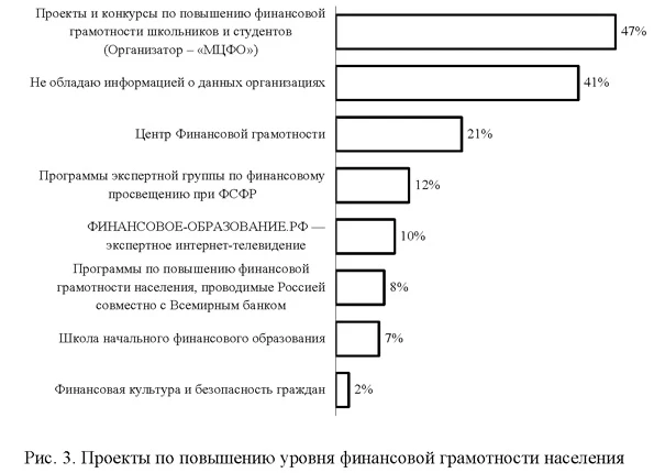 Однако следует констатировать тот факт, что порой не обо всех программах по повышению финансовой грамотности известно населению. Так, опрос респондентов, какие программы им известны, показал, что 41% респондентов (второй результат по выборке) вообще не обладает информацией ни об одной из указанных программ (рис. 3)3. Какие Вы знаете программы, проекты по повышению уровня финансовой грамотности?![]() Таким образом, можно констатировать, что хотя определенная деятельность по повышению финансовой грамотности населения и началась, далеко не все о ней знают. Здесь важную роль должны сыграть СМИ, которые могли бы своевременно оповещать россиян о существующих проектах и программах и проводимых мероприятиях. Попытка выяснить у самих респондентов, какие действия правительства, по их мнению, могут способствовать повышению финансовой грамотности населения, дала следующие результаты: 28% опрошенных высказались за проведение всевозможных программ по повышению финансовой грамотности для студентов; 27% - за внедрение в общеобразовательных школах уроков, посвященных финансовой грамотности; 23% - за проведение обучающих семинаров для трудовых коллективов; 22% - за реализацию комплексных программ по финансовому просвещению населения.