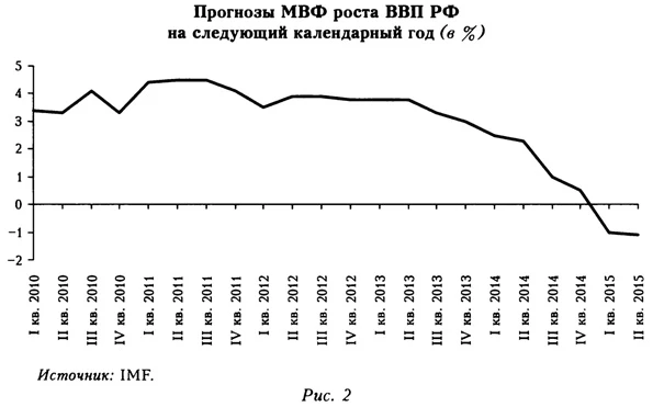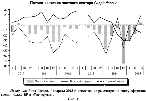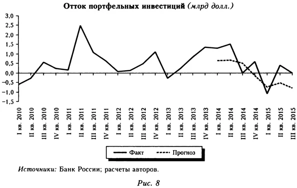 В III кв. 2014 г. отток оказался на 0,5 млрд долл. меньше прогнозного; в среднем за III кв. 2014 и I-II кв. 2015 г. он соответствует прогнозному (рис. 8; в III кв., по предварительной оценке, отток оказался на 0,8 млрд долл. больше). Соответственно дополнительные отклонения по данной компоненте в прогноз не закладываются.