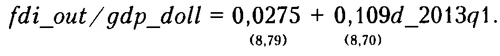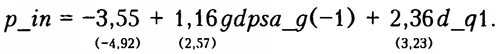 Приток портфельних инвестиций (участие в капитале; долговые инструменты учитываются через норму рефинансирования)На данную компоненту притока капитала значимо влияют лагиро-ванные темпы роста ВВП (квартальные, очищенные от сезонности) gdpsa_g(-1). Кроме того, в период после кризиса 2008-2009 гг. наблюдаются общий тренд к сокращению объема накопленных портфельных инвестиций, а также выраженная сезонность (приток оказывается выше в I кв., что учитывается через дамми-переменную d_q1). Уравнение для ожидаемого притока капитала имеет следующий вид: