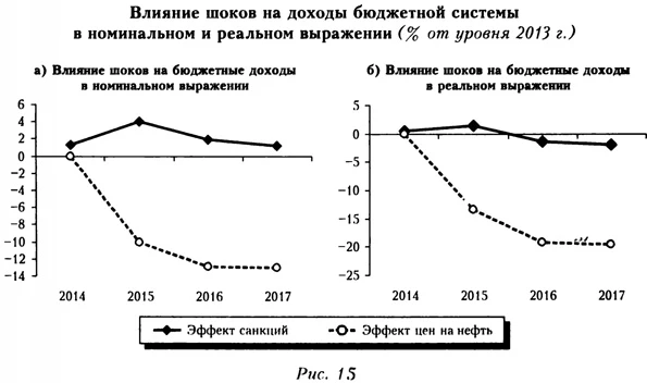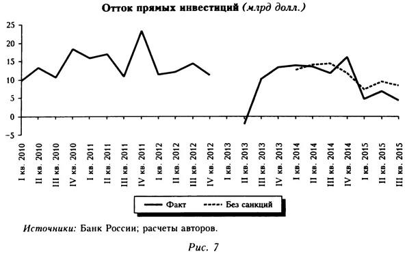 В III кв. 2014 г. этот показатель оказался на 6,2 млрд долл. ниже прогнозного. В I кв. 2015 г. расхождение оказалось еще больше (8,9 млрд долл.; рис. 6), что, видимо, объяснялось понижением суверенного рейтинга РФ агентством Standard and Poor's. Хотя на пересмотр рейтинга повлияли и санкции против РФ, основным фактором скорее всего стало падение цен на нефть (это отчасти подтверждают приводимые ниже расчеты, свидетельствующие о слабом негативном влиянии санкций на бюджетные доходы в среднесрочной перспективе). Соответственно мы учитываем эффект санкций на приток капитала в госсектор только в 2014 г., но не в 2015-2017 гг.