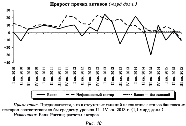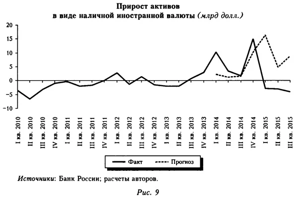 При оценке эффекта санкций в данном случае нужно учитывать, что население начало скупать валюту уже в первом полугодии 2014 г. на фоне обострения ситуации на Украине, а также давления на рубль, связанного со сворачиванием программы «количественного смягчения» ФРС США. По этим причинам рост соответствующих активов был значительно выше прогнозного (рис. 9), и в III кв. непосредственно введение санкций не привело к его дополнительному ускорению. В среднем за три квартала 2014 г. накопление наличной валюты было на 4,0 млрд долл. выше прогнозного. Оценки за 1-Й кв. 2015 г. в данном случае недостаточно репрезентативны, так как в значительной степени отражают эффект «отскока» после панической покупки валюты в IV кв. 2014 г. (этот «отскок» продолжался и в III кв. 2015 г.). Ввиду недостаточности данных при моделировании на 2015-2017 гг. мы не закладываем дополнительный эффект санкций в виде увеличения покупок валюты.