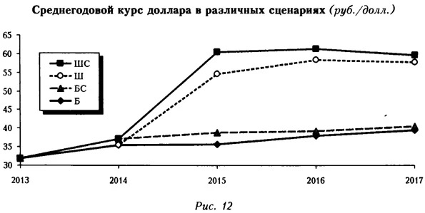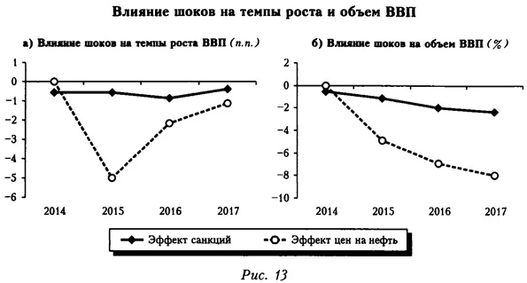 Увеличение оттока капитала, естественно, приводит к ослаблению курса рубля (рис. 12). Так, в 2015 г. санкции, по нашим оценкам, повышают обменный курс доллара примерно на 6 руб. Данный эффект уменьшается со временем, поскольку больший отток капитала ассоциируется с улучшением чистой внешней позиции и соответственно баланса инвестиционных доходов (в результате к 2017 г. влияние санкций на среднегодовой курс доллара оценивается лишь на уровне 2 руб.).