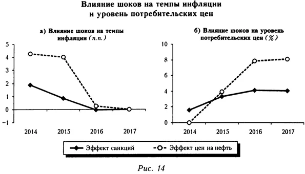Заметим, что значительное снижение ВВП в ответ на падение цен на нефть отражает преобладающую в российской экономике «пассивную» адаптацию к таким шокам. Реальное ослабление рубля при ухудшении условий торговли лишь незначительно увеличивает физический объем экспорта (в котором доминирует слабо чувствительный к обменному курсу нефтегазовый экспорт) (см.: Гурвич, Прилепский, 2013). Снижение реального курса не оказывает также значимого влияния на объем поставок торгуемых отечественных товаров на внутренний рынок (см.: Бланк и др., 2006). Таким образом, основной реакцией на падение цен на нефть служит снижение производства неторгуемых товаров из-за сжатия внутреннего спроса. Сценарии с санкциями характеризуются также более высокой инфляцией (рис. 14). Это связано как с последствиями введения продовольственного эмбарго (эффект которого, по оценкам Е. Гурвича и др. (2014), составляет 1,2 п. п. в 2014 и 0,8 п. п. в 2015 г.), так и с эффектом переноса обменного курса на инфляцию. Вместе с тем дополнительное сжатие внутреннего спроса в санкционных сценариях несколько сдерживает инфляцию. Влияние обоих шоков на темпы инфляции в основном исчерпывается 2014-2015 гг., а суммарное воздействие на уровень потребительских цен оценивается примерно на уровне 4% для санкций и 8% — для падения цен на нефть. Если сравнивать накопленный рост ИПЦ за 2014-2017 гг., то санкции добавляют к нему 5,7 п. п., а снижение цен на нефть — 11,0 п.п.