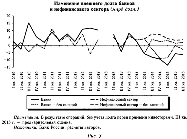 1 https://www.whitehouse.gov/the-press-office/2015/01/20/remarks-president-state-union-address-january-20-2015. 2 Здесь и далее, говоря об изменении объема внешних обязательств, мы имеем в виду их изменение за счет операций, без учета валютной переоценки. Источниками подобной статистики являются Банк России и C-bonds. Это позволяет отделить отражаемое в изменении внешнего долга воздействие санкций на потоки капитала от изменения долга за счет ослабления рубля (что существенно в условиях, когда примерно V- внешнею долга российских эмитентов номинирована в рублях). 3 Этот период для краткости далее будем называть «санкционным». 4 http: //economy.gov.ru/minec/about/'structure/depMacro/20151026. 5 Напомним, что в соответствии с методикой платежного баланса РПБ5 отток капитала отражается со знаком «минус», поэтому снижение оттока формально выглядит на рисунке как рост его значения. 6 Для 2017 г. мы делаем оценку подлежащего погашению долга, применяя средний расчетный срок до погашения по данным за 2015 — 2016 гг. 7 http://www.kremlin.ru/acts/ bank / 39268. 8 http://www.minfin.ru/ru/document/ ?id_4=60503. 9 http://asozd2.duma.gov.ru 'main.nsf 0o28SpravkaNew°o29?OpenAßent&RN=911755-6&vJ2. 10 http://cbr.ru/publ/ondkp/on_2015(2016-2017).pdf. Список литературы / ReferencesБланк А., Гурвич Е., Улюкаев А. (2006). Обменный курс и конкурентоспособность отраслей российской экономики // Вопросы экономики. № 6. С. 4—24. [Blank А., Gurvich E.f Ulyukaev А. (2006). Exchange rate and competitiveness of Russia's industries. Voprosy Ekonomiki, No. 6, pp. 4—24. (In Russian).] Веркей Ж. (2014). Российская экономика и санкции. Оценка последствий украинского конфликта. (Записка аналитического центра Обсерво № 9). М.: Франко-российская торгово-промышленная палата. [Vercueil J. (2014). The impact of sanctions on the Russian economy. Assessing the consequences of the Ukrainian conflict (Note from the Observatoire franco-russe No. 9). Moscow: CCI France Russie. (In Russian).] Гурвич E., Прилепский И. (2013). Как обеспечить внешнюю устойчивость российской экономики // Вопросы экономики. № 9. С. 4—39. [Gurvich Е., Prilepskiy I. (2013). How to secure external sustainability of the Russian economy. Voprosy Ekonomiki, No. 9, pp. 4—39. (In Russian).] Гурвич E. Т. и др. (2014). Сценарии развития российской экономики в условиях санкций и падения цен на нефть. М.: Комитет гражданских инициатив. [Gurvich Е. et al. (2014). Scenarios of development of the Russian economy in the conditions of sanctions and falling oil prices. Moscow: Civil Initiatives Committee. (In Russian).] Орлова H. (2014). Финансовые санкции против России: влияние на экономику и экономическую политику // Вопросы экономики. № 12. С. 54 — 66. [Orlova N. (2014). Financial sanctions: Consequences for Russia's economy and economic policy. Voprosy Ekonomiki, No. 12, pp. 54 — 66. (In Russian).] Синяков А., Ройтман А., Селезнев С. (2015). Динамика потенциального ВВП России после нефтяного шока: роль сильного изменения относительных цен и структурных жесткостей. М.: Банк России. [Sinyakov A., Roitman A., Seleznyov S. (2015). Dynamics of Russia's potential GDP after the oil shock: The role of large change in relative prices and structural rigidities. Moscow: Bank of Russia. (In Russian).] Улюкаев A., May В. (2015). От экономического кризиса к экономическому росту, или Как не дать кризису превратиться в стагнацию // Вопросы экономики. № 4. С. 5 — 19. [Ulyukaev А., Mau V. (2015). From economic crisis to economic growth, or how to prevent the crisis from turning into stagnation. Voprosy Ekonomiki, No. 4, pp. 5 — 19. (In Russian).] Широв А., Литовский А., Потапенко В. (2015). Оценка потенциального влияния санкций на экономическое развитие России и ЕС // Проблемы прогнозирования. № 4. С. 3-16. [Shirov A., Yantovskiy A., Potapenko V. (2015). Estimation of potential impact of sanctions on the economic development of Russia and the EU. Problemy Prognozirovaniya, No. 4, pp. 3 — 16. (In Russian).] Boulanger P., Dudu H., Ferrari E., Philippidis G. (2015). The cost of import prohibition for political reason: CGE analysis of the Russian ban on agri-food products. 18th Annual Conference on Global Economic Analysis "Information for the Policy Maker: Practical Economic Modelling for Tomorrow", June 17—19, Melbourne, Australia. Fratzcsher M. (2011). Capital flows, push versus pull fa