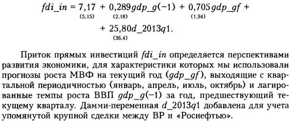Применительно к другим элементам финансового счета мы использовали несколько иной способ анализа. Для построения «нормальных» показателей ввоза и вывоза капитала для каждой компоненты платежного баланса на основе квартальных данных за период после кризиса 2008-2009 гг. строились уравнения, описывающие изменение активов и обязательств нефинансового сектора (по отдельности, в млрд долл.) в зависимости от цен на нефть, объема ВВП, ожидаемых темпов экономического роста и т. п. Отметим, что выбор краткого периода для моделирования снижает точность получаемых оценок, однако, на наш взгляд, он обоснован с учетом качественного изменения денежно-кредитной политики Банка России, проводившего постепенный переход к режиму инфляционного таргетирования и плавающего обменного курса. Это, в частности, дестимулировало приток краткосрочного капитала в посткризисный период из-за уменьшения предсказуемости курса рубля. Приток прямых инвестицийДля данной компоненты было получено следующее уравнение (здесь и далее в скобках под коэффициентами приведены значения t-статистики):