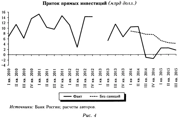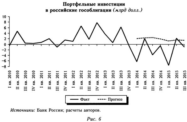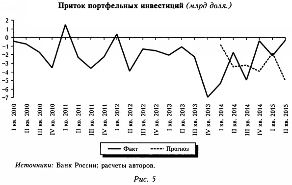 Результаты моделирования представлены на рисунке 4. В III кв. 2014 г. фактический приток оказался ниже «нормального» на 8,8 млрд долл., а в среднем за III кв. 2014 и I-II кв. 2015 г. — на 4,5 млрд долл. (данная оценка используется в дальнейшем при среднесрочном моделировании). Предварительная оценка за III кв. 2015 г. дает несколько меньшую величину — 2,5 млрд долл.