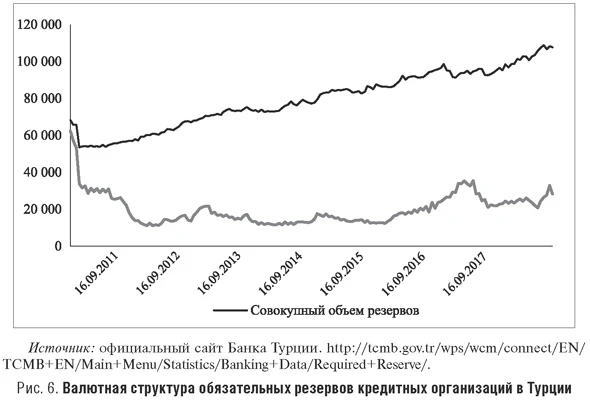 Банк Турции также использует механизм начисления процентов на обязательные резервы как инструмент дедолларизации экономики. Начисляя дифференцированные проценты, а в отдельные периоды и вовсе отменяя их начисление на резервы по депозитам в иностранной валюте, регулятор получает возможность воздействовать на заинтересованность кредитных организаций в привлечении депозитов в национальной валюте. Например, в ноябре 2014 года начисление процентов на резервы, внесенные по обязательствам в иностранной валюте, было приостановлено. Возобновлена эта практика была только в мае 2015 года. Новшеством Банка Турции можно считать решение о формировании обязательных резервов в иностранной валюте и/или золоте. Принятый в конце 2011 года подход дает право кредитным организациям вносить резервы в долларах по всем депозитам/вкладам не только в иностранной6, но и в национальной валюте. В результате в настоящее время подавляющая часть обязательных резервов номинирована в иностранной валюте и золоте, тогда как на долю резервов в турецких лирах приходится только 22,7% всех резервов (рис. 6). При этом необходимо отметить, что такой подход рассматривается регулятором в качестве дополнительного элемента денежно-кредитной политики, содействующего стабилизации обменного курса турецкой лиры.