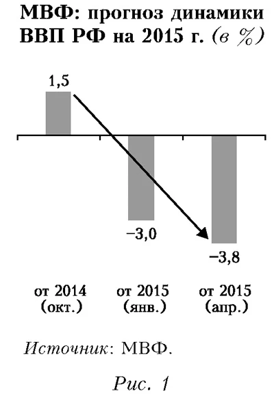 В начале 2015 г. МВФ ухудшил прогноз развития экономики России на текущий год более чем в восемь раз по сравнению с аналогичным прогнозом, данным шесть месяцев назад (рис. 1). Причем ожидается, что негативные темпы прироста российского ВВП могут сохраниться и в будущем. В этот период произошло масштабное ужесточение денежно-кредитной политики ЦБ РФ (резко повышена ключевая ставка в декабре 2014 г.) на фоне снижения цен на нефть и закрытия внешних финансовых рынков. Необходимость роста ставок в России отмечала и миссия МВФ: «Для выполнения установленного Банком России на 2015 г. целевого показателя по инфляции... Банку России следует быть готовым в течение следующего года дополнительно повысить процентные ставки» (IMF, 2014. P. 3).
