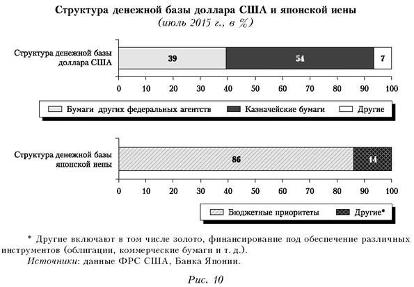 Нужно ли повышать монетизацию российской экономики за счет нефтяного сектора?Складывающийся дефицит федерального бюджета (в 2015 г. ожидается 2,9% ВВП) у многих вызывает опасения. При этом следует иметь в виду, что дефицит выступает неотъемлемым атрибутом будущего экономического роста. Даже на микроуровне, чтобы произвести продукцию и получить прибыль, необходимо сначала купить сырье, нанять рабочую силу, арендовать помещение и т. д., то есть изначально работать в условиях дефицита и лишь потом — после реализации продукции — покрыть его за счет дохода, обеспечивая рост. Поэтому дефицит служит важным механизмом поддержания роста. Но здесь главное — решить проблему финансирования дефицита. В прежние годы основным источником такого финансирования в российской экономике была внешняя сфера. В период санкций, когда доступ к внешним займам ограничен, субъекты экономики для получения средств должны прежде всего выходить на внутренние рынки. Внутренние источники финансирования имеют два основных компонента: первый — частный сектор (корпоративные средства и средства населения), второй — госсектор. Объема средств первого недостаточно для обеспечения необходимого роста экономики. Кроме того, при направлении этих средств на бюджетные цели не будет поддерживаться рост экономики в целом (поскольку вместо требуемого прироста финансовых ресурсов мы получим лишь их переток из одних отраслей в другие). Поэтому вызывают сомнение предложения об изъятии дополнительных доходов, полученных нефтяным сектором от девальвации рубля, для покрытия дефицита бюджета, которые активно обсуждают в правительстве. Проблему обеспечения экономического роста можно эффективно решать без ущерба для отдельных отраслей при более активном использовании целевого финансирования с включением в процесс денежных властей (ЦБ и Минфина). Например, в США и Японии наиболее важным источником финансирования роста выступает государственный (бюджетный) механизм при одновременном участии в финансировании ЦБ как главного источника финансовых ресурсов и эмиссионного центра. Данные подходы успешно применяют в этих странах в течение многих десятилетий (рис. 10). В США на казначейские облигации приходится 93% денежной базы доллара, а в Японии на японские гособлигации — 83% денежной базы иены. Согласно опубликованному годовому отчету Центрального банка РФ за 2014 г., доля долговых обязательств Минфина РФ в денежной базе рубля составляет всего 3,8% (на начало 2015 г.).