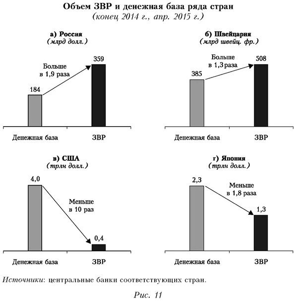 В США и Японии ЦБ покупает госбумаги, выпущенные их Минфином, и одновременно осуществляет эмиссию, причем целевую, которая направляется соответственно Министерству финансов. При этом купленные ЦБ бумаги потом обычно не участвуют в обратной операции, предполагающей продажу бумаг на рынке и стерилизацию эмитированных денег. Приобретенные госбумаги, как правило, размещают на балансе ЦБ до срока их истечения (на 10, 20, 30 лет). Другими словами, экономика получает «длинные» и целевые инвестиционные ресурсы. Более того, когда срок обращения бумаг заканчивается, часто осуществляют новую эмиссию и покупают новые бумаги, что делает процесс поддержания «длинных» ресурсов в экономике при необходимости практически бессрочным. Участие ЦБ в указанных механизмах позволяет финансировать решение бюджетных задач, не сокращая ликвидность финансового рынка в целом. Если бы госбумаги просто размещали на вторичном рынке, то их — при интересе со стороны его участников — покупали бы частные компании и банки, и тогда инвестированные ими средства ушли бы на финансирование указанных госпрограмм. На иные цели текущей коммерческой деятельности (кредитование и т. д.) средства уже нельзя было бы израсходовать. В результате денежные власти формируют мощный пласт целевых «длинных» денег в соответствии с приоритетами экономической политики (ипотека, малый бизнес, региональные программы и т. д.). По сути, ЦБ предоставляет долгосрочный кредит экономике, а она таким образом уже изначально получает существенный инвестиционный потенциал, который мультиплицируется по мере подключения к работе с «длинными» проектами частного сектора (субподрядчиков и т. д.). Более того, целевая эмиссия позволяет направлять финансовые ресурсы на приоритетные цели, что насыщает соответствующие сферы ресурсами и снижает процентные ставки (как в последние годы в США, где в результате использования указанных механизмов ставки по ипотечным займам снизились с 7-8% до 3-4%). В целом задействование механизма целевой долгосрочной эмиссии будет способствовать насыщению экономики «длинными» деньгами, диверсификации инструментов на рынке, оживлению соответствующего сегмента рынка, снижению процентных ставок. При этом другие отрасли экономики сохранят свои финансовые ресурсы и получат преимущества благодаря новым возможностям. О возможностях курсовой стабильностиПроизошедшую масштабную девальвацию рубля можно было предотвратить, поскольку регуляторы имеют возможности обеспечить стабильность валютного курса благодаря большим золотовалютным резервам России. Их объема более чем достаточно, чтобы переломить любые тренды на рынке и помочь установить необходимые курсовые ориентиры. Зарубежные эксперты также указывают на это обстоятельство, говоря, что «Россия — страна с валютой, обеспеченной золотом», и лишь вопрос времени, когда она это преимущество реализует4. Размер золотовалютных резервов России сейчас превышает величину всей рублевой эмиссии (денежной базы) почти в два раза. По этому критерию рубль относится к категории обеспеченных валют (о чем необходимо напоминать рынку) (рис. 11).