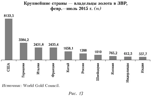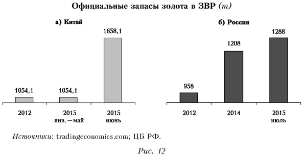 Другими словами, все рубли в экономике теоретически могут быть стерилизованы. Естественно, никто этого делать не будет, но нужно довести до сведения участников рынка, что при необходимости регуляторы имеют масштабные возможности воздействовать на него. Кроме того, указанные объемы ЗВР технически позволяют регуляторам установить такой валютный курс рубля, который целесообразен для решения задач, стоящих перед экономикой. Если объяснить участникам рынка предпочтения и возможности регуляторов, то рынок будет играть не против них, а вместе с ними, иначе это будет означать потери для таких игроков. Другое дело, что у нас регуляторы придерживаются режима невмешательства, поэтому участники рынка теряются в догадках относительно дальнейшего тренда на нем. О «подушках безопасности»Напряжение, уже отмечающееся на отдельных рынках, заставляет некоторых ведущих участников создавать антикризисную «подушку безопасности», которая позволит пережить финансовые потрясения и сохранить свои позиции в условиях возможных кризисных обострений. Так, Китай и Россия за последние годы масштабно увеличили запасы золота (рис. 12), причем КНР сделала это наиболее резко именно в последние месяцы. При этом обе страны располагают значительными золотыми резервами (рис. 13). ![]()