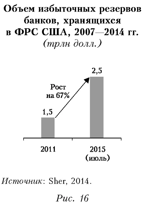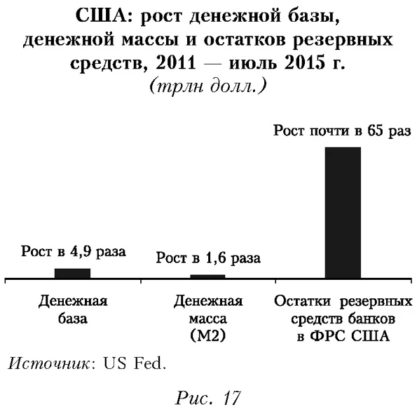 По имеющимся сведениям, Китай начал распродажу американских казначейских облигаций, что, по-видимому, может быть связано не только с необходимостью получить валюту для поддержки юаня, но и с негативными оценками перспектив американской экономики. Только за июль-август 2015 г. объем продаж этих облигаций, по оценкам, превысил 100 млрд долл. Американские, и не только, инвесторы переводят значительную часть активов в наличные деньги (рис. 14-15). Так обычно происходит, когда нет уверенности в перспективах рынка. В частности, американские банки размещают свою ликвидность на резервных счетах в ФРС (рис. 16), по сути выводя деньги из экономики. Этот факт в немалой степени объясняет то, что при масштабной накачке (эмиссии) долларов (рис. 17) инфляция в США остается низкой — около 0,2% (июль 2015 г./июль 2014 г.). ![]() ![]() ![]()