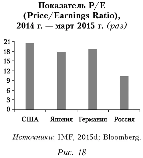 В американском штате Техас принят закон о репатриации золотой квоты штата, хранящейся в ФРС Нью-Йорка (в размере 1 млрд долл.), в золотые хранилища самого штата. По-видимому, его руководство испытывает недоверие к федеральным властям и в случае наступления кризиса считает целесообразным хранить все золото у себя. Данный факт иллюстрирует настроения отдельных участников; по мере ухудшения ситуации они могут получить более широкое распространение. По оценкам Дж. Роджерса, в настоящее время Россия — один из самых привлекательных рынков с точки зрения инвестиций. По сути, речь идет о двойном эффекте недооцененности применительно к нашей стране. С одной стороны, фундаментально недооценены сами активы (акции и др.), а с другой — недооценен валютный курс. С учетом этого суммарная оценка полученных иностранными инвесторами российских финансовых активов еще больше возрастает. Действительно, по показателю Р/Е (отношение цены акции к доходу) Россия по-прежнему существенно отстает от рынков многих стран (рис. 18).