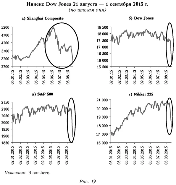 «Риски продолжают перемещаться на развивающиеся рынки... на фоне повышенных уровней рыночного риска и риска ликвидности», — говорится в октябрьском обзоре финансовой стабильности МВФ (IMF, 2015c. P. 1). Действительно, именно падение на китайском фондовом рынке в июне 2015 г. было предвестником масштабного снижения мировых фондовых индексов в конце августа (рис. 19). Хотя затем рынки развернулись, отыграв в значительной степени потери, участники понимают, что существует угроза последующего, более глубокого падения (как уже бывало).