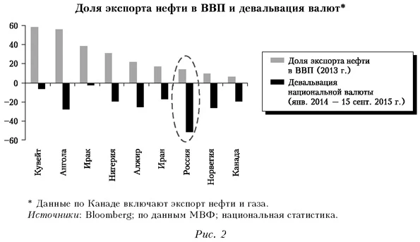 При этом рекомендации МВФ для США в 2015 г. предполагали диаметрально противоположную логику и выглядели гораздо более адекватными: «Преждевременное повышение ставок может вызвать ужесточение финансовых условий или расшатывание финансовой стабильности, что будет препятствовать росту экономики (курсив мой. — М. Е.)» (IMF, 2015b). Действительно, в последние годы в России прослеживается отчетливая корреляция между повышением ставок и экономическим ростом, когда рост ставок тормозит рост экономики и наоборот. Ситуация осложнилась из-за возникшей курсовой нестабильности, девальвации курса рубля и неопределенности на валютном рынке в целом. Отметим, что с введением режима свободного плавания рубль резко обесценился, продолжив свое снижение, которое началось еще раньше — вследствие падения цен на нефть. Масштаб обесценения российского рубля был больше, чем валют других стран-нефтеэкспортеров (рис. 2), причем даже тех, у кого доля экспорта нефти в ВВП выше, чем в России, и которые должны были бы сильнее реагировать на столь значительное падение цен на нефть.