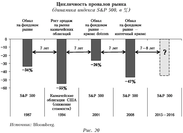 Указанные события были ожидаемы, поскольку масштабная накачка ликвидности со стороны ЦБ ведущих стран в ходе борьбы с последним финансовым кризисом привела к избытку средств в мире, которые ищут сферы вложения. В условиях очень низких процентных ставок это приводит к объемным вложениям финансовых ресурсов в различные активы (в первую очередь акции), что вызывает неоправданный рост цен на них и ведет к перегреву рынков, повышая вероятность очередного финансового кризиса. При этом финансовые кризисы происходят с периодичностью 6-8 лет, не совпадающей с периодичностью других известных циклов (Кондратьевский и др.) (рис. 20).