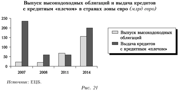 Эти кризисы, прямо не связанные с реальной экономикой, все равно имеют свою периодичность. Поэтому можно предположить либо собственную периодизацию циклов в финансовой сфере, либо их искусственный, рукотворный характер, при котором кризисы провоцируют, чтобы решать некие системные задачи (передел сфер влияния, собственности и др.). Согласно указанной периодичности, 2015-2016 гг. могут стать годами серьезных финансовых осложнений в мире. По мнению Роджерса, «в течение ближайших 1-2 лет мы увидим огромные проблемы на мировом финансовом рынке»5. По оценкам Р. Пола, США находятся на пороге «катастрофического экономического кризиса, гораздо более плохого, чем кризис 2008 г.»6. При этом многие эксперты считают, что падение рынков может превысить 50% и наступление такого кризиса лишь дело времени, поскольку фундаментальные диспропорции не устраняются, а только обостряются.Из-за низкой доходности большинства стандартных бумаг усиливается интерес инвесторов к более высокодоходным инструментам. Их роль снова начинает расти, увеличивая риски в финансовой системе (рис. 21).