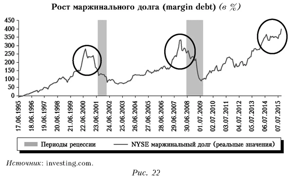 Участники рынка начинают активнее использовать кредитное «плечо», что проявляется в увеличении показателя маржинального долга (margin debt). В результате внутри финансовой системы формируются большие пузыри и возникает потенциал ее дестабилизации. Обратим внимание на падения, которые следовали за ростом указанного показателя в прошлом (рис. 22).